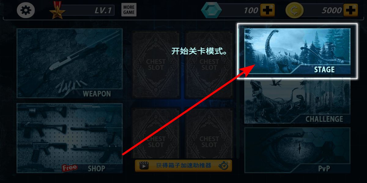 1、進(jìn)入主界面后,在武器寶箱槽等功能區(qū)中,找到右側(cè)標(biāo)有STAGE的關(guān)卡模式入口點(diǎn)擊,快速開啟關(guān)卡挑戰(zhàn)流程,逐步推進(jìn)游戲進(jìn)程。