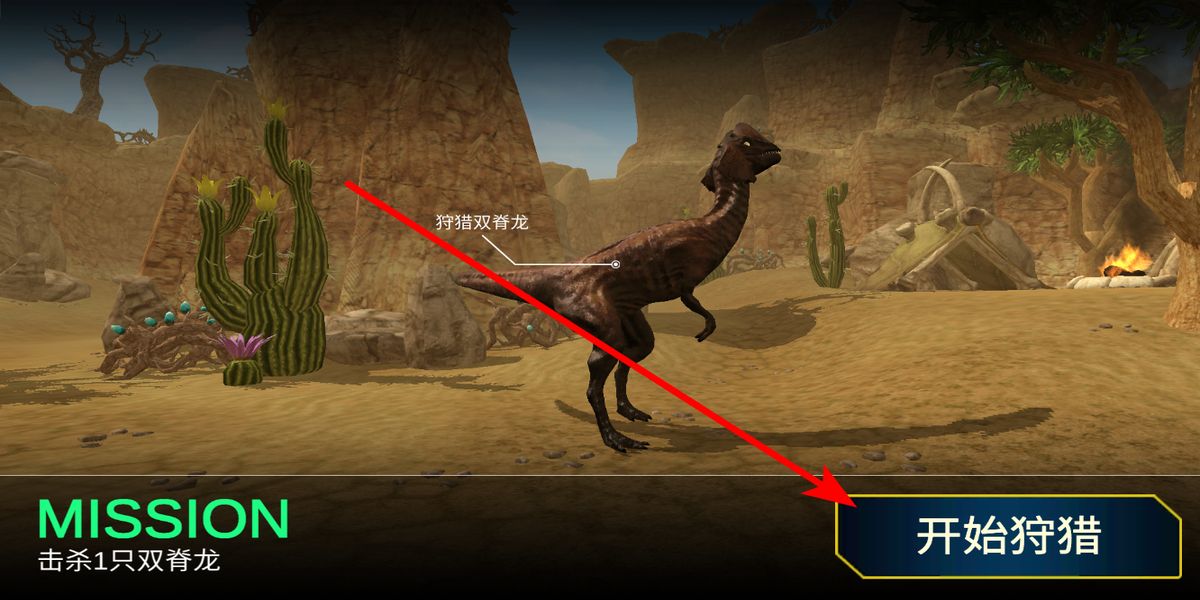 2、確認(rèn)狩獵目標(biāo)為雙脊龍后,查看場景中恐龍狀態(tài)與環(huán)境布局,點(diǎn)擊界面右下角的開始狩獵按鈕,順利進(jìn)入戰(zhàn)斗場景執(zhí)行獵殺任務(wù)。