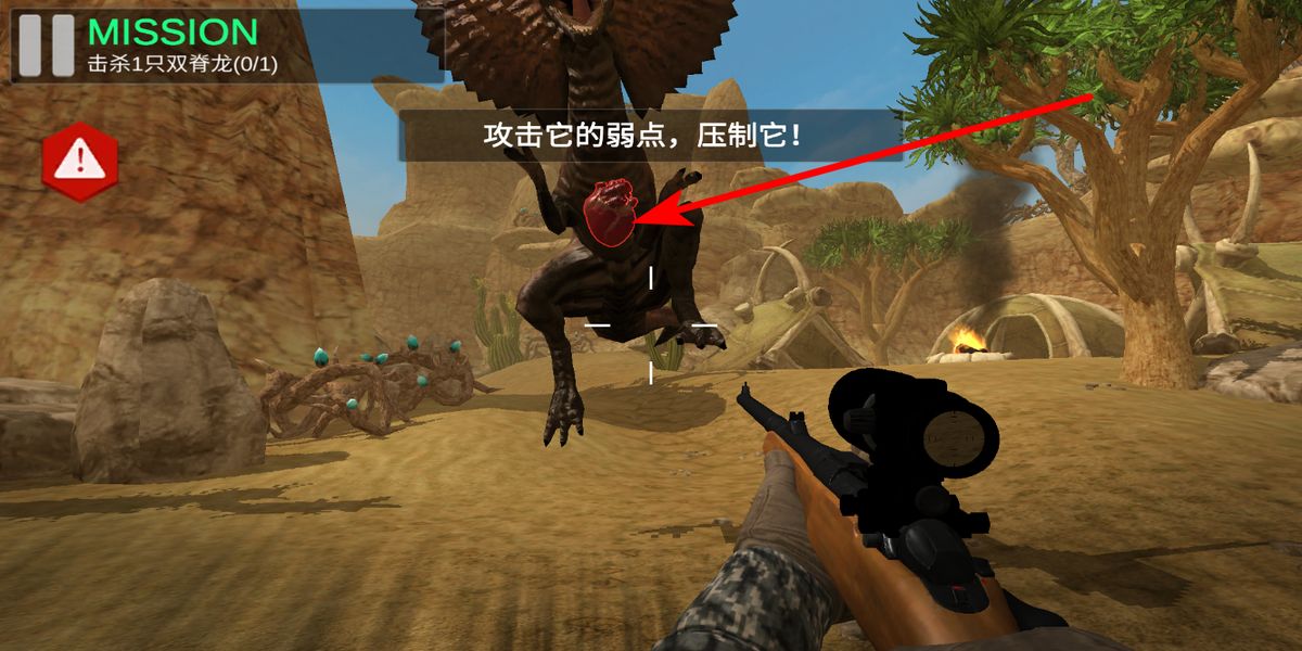 2、關(guān)卡指定任務(wù):每個(gè)關(guān)卡都有明確的任務(wù)要求,如殺死2只禽龍、完成2次肺部射擊等,玩家需按任務(wù)目標(biāo)行動(dòng),推動(dòng)游戲進(jìn)程解鎖新內(nèi)容。