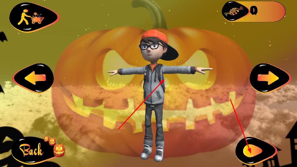 1、在角色定制界面,借助左右箭頭按鈕調(diào)整角色姿勢,點擊左上角購物圖標(biāo),解鎖南瓜帽、背包等萬圣節(jié)主題裝扮,塑造專屬冒險形象,為闖關(guān)預(yù)熱。