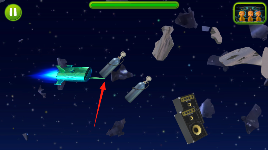 1、太空關(guān),操控綠色火箭,避隕石、撿道具氧氣瓶,保飛行器續(xù)航,吃星星,攢積分,沖高分,解鎖新關(guān)卡。