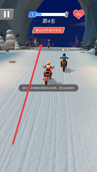2、比賽中處于第4名時(shí),駕駛摩托加速靠近前方對(duì)手,若攜帶武器則發(fā)動(dòng)攻擊,借此提升排名,向著更高名次沖刺。