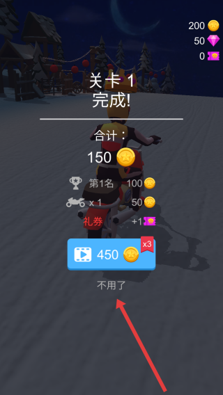 3、關(guān)卡1完成后,若不愿觀(guān)看廣告獲取450金幣,點(diǎn)擊不用了按鈕,直接領(lǐng)取150金幣等基礎(chǔ)獎(jiǎng)勵(lì),結(jié)束本次關(guān)卡。