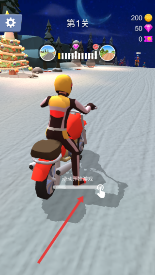 1、在摩托游戲第1關(guān)界面,滑動(dòng)屏幕啟動(dòng)摩托,駕駛它在雪地賽道開(kāi)啟競(jìng)速挑戰(zhàn),準(zhǔn)備應(yīng)對(duì)賽程中的障礙與對(duì)手。