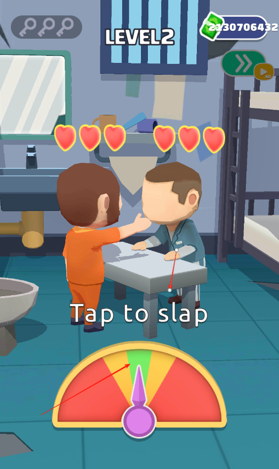 2、觀察指針,當(dāng)指針指向綠色區(qū)域的時(shí)候點(diǎn)擊屏幕,讓角色掌摑另一角色,完美掌摑會直接扣對方兩顆心。