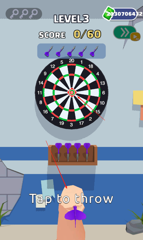 3、點(diǎn)擊屏幕投擲紫色飛鏢,瞄準(zhǔn)靶心區(qū)域,盡可能命中高分環(huán),累計(jì)得分達(dá)60可通過關(guān)卡。