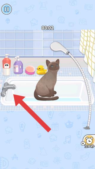 2、點(diǎn)擊清潔貓咪這個游戲關(guān)卡,玩家進(jìn)入到場景內(nèi)會有新手指引的提示,點(diǎn)擊水龍頭進(jìn)行放水。