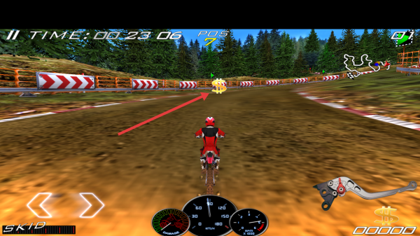 2、進入01號賽道后,操控紅色越野摩托,按賽道指引,如金幣標識行駛,避過障礙紅白護欄。