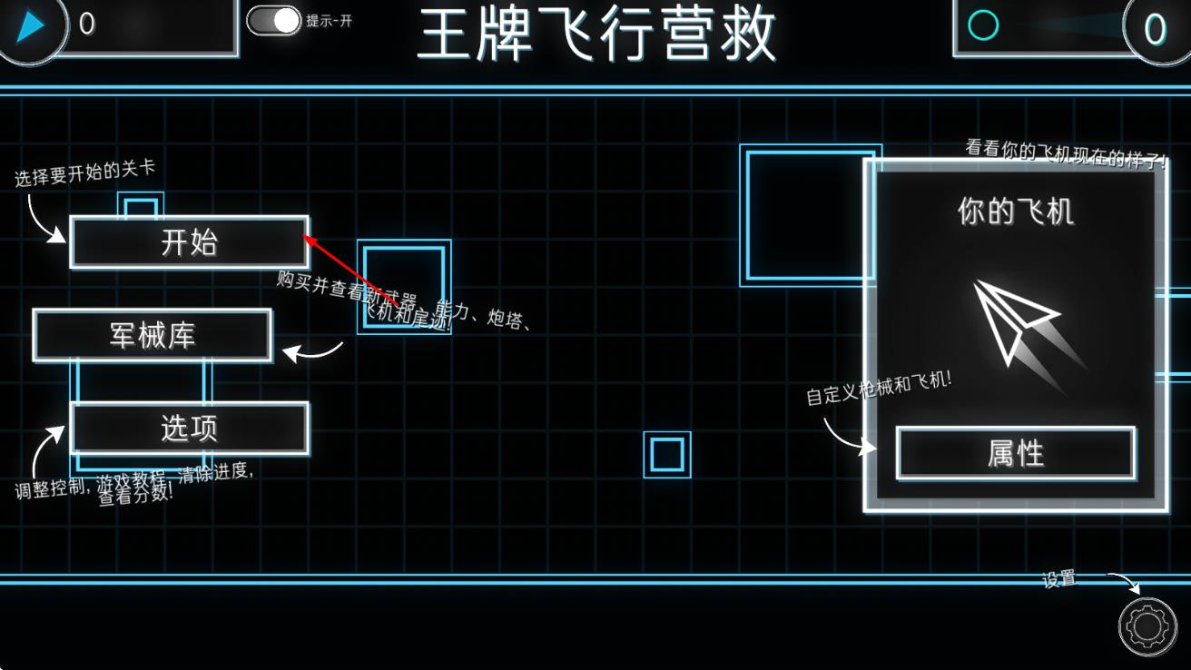 1、進入游戲后選擇飛行器與關(guān)卡,通過虛擬搖桿或滑動屏幕控制飛行方向,躲避障礙物并接近營救目標。