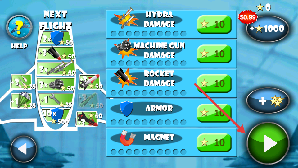 1、左側(cè)按鈕選擇飛機(jī),然后點(diǎn)中間按鈕進(jìn)入戰(zhàn)斗,快速完成目標(biāo)推進(jìn)關(guān)卡。