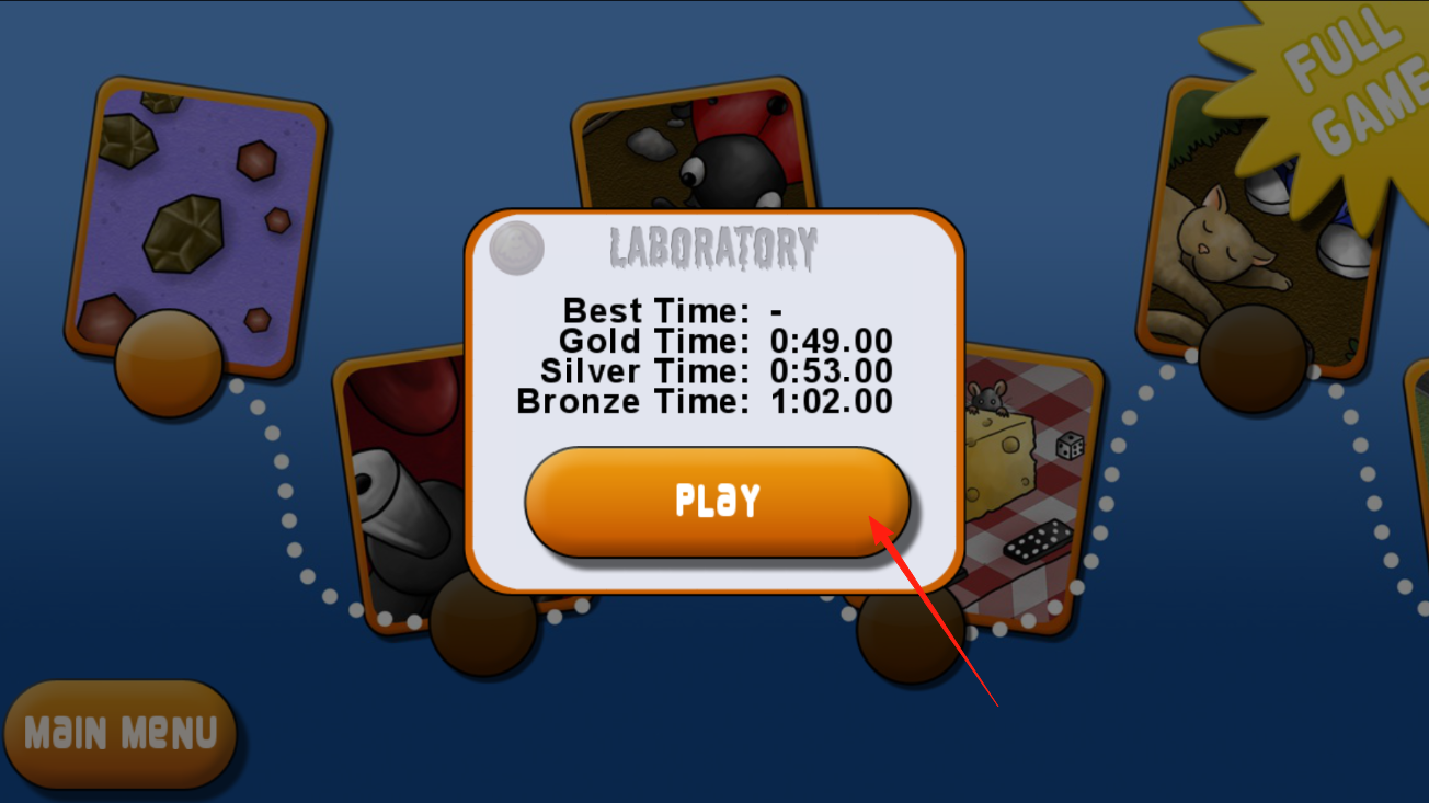 1、在關(guān)卡選擇界面,看到LABORATORY關(guān)卡的時(shí)間挑戰(zhàn)目標(biāo),想玩這個(gè)關(guān)卡,點(diǎn)PLAY”按鈕進(jìn)入實(shí)驗(yàn)室場(chǎng)景,嘗試在規(guī)定時(shí)間內(nèi)完成挑戰(zhàn),爭(zhēng)取拿到金銀銅牌時(shí)間獎(jiǎng)勵(lì)。