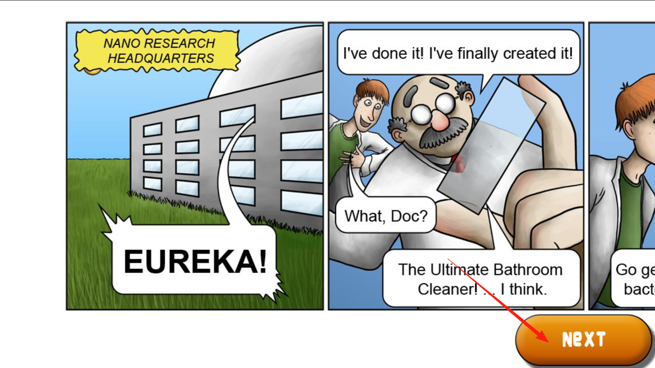 2、進(jìn)入漫畫劇情,展示納米研究總部和博士的發(fā)明,推進(jìn)劇情,看看博士的終極浴室清潔劑后續(xù)咋發(fā)展,解鎖游戲正式玩法前的劇情內(nèi)容。