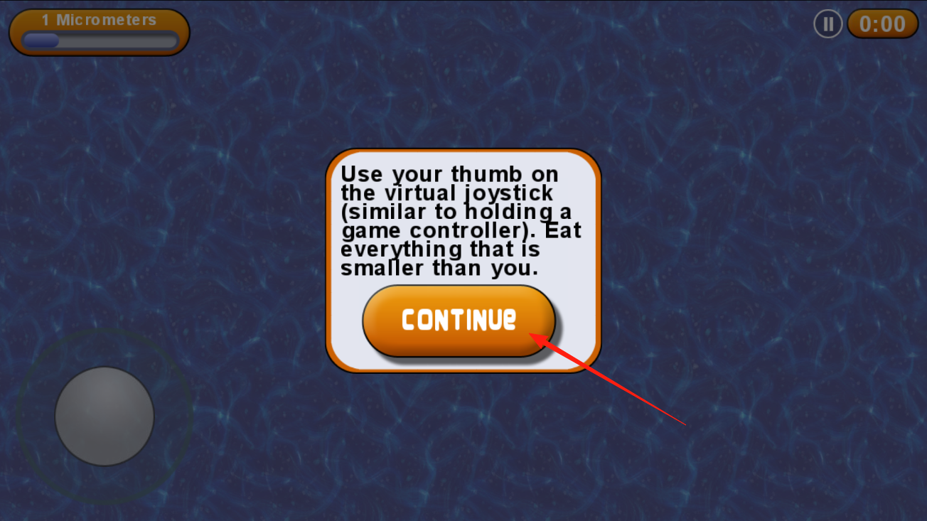 3、看到操作提示,要用虛擬搖桿控制角色,吃比自己小的東西,用左下角搖桿移動(dòng),在微觀世界里,找比自己小的物體吃掉,讓角色成長(zhǎng),開始這場(chǎng)吞噬冒險(xiǎn)。