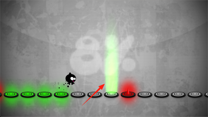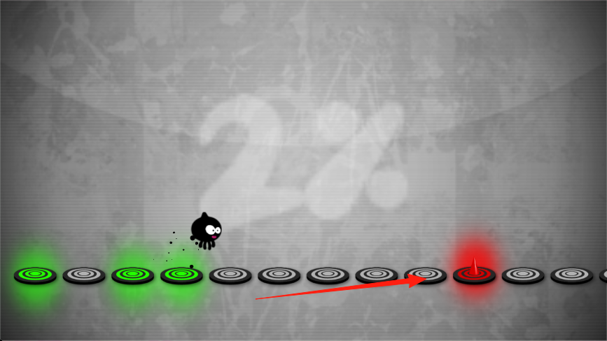 1、點(diǎn)屏讓小黑怪跳,踩綠圓盤(pán)續(xù),避紅刺,按節(jié)奏跳,過(guò)圓盤(pán)陣,保角色存活,推進(jìn)關(guān)卡。