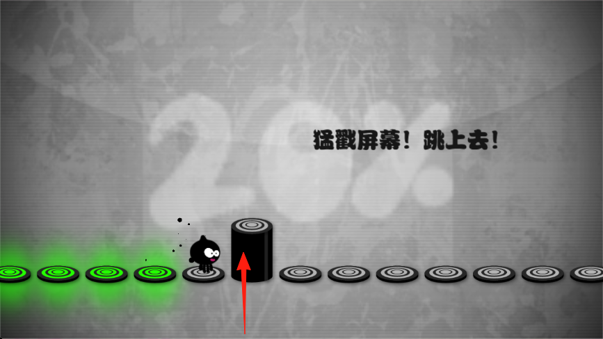 3、見(jiàn)猛戳屏幕!跳上去!提示,點(diǎn)屏讓小黑怪跳黑圓柱,掌握跳躍力度、時(shí)機(jī),跳上后繼續(xù),完成關(guān)卡,解鎖隱藏獎(jiǎng)勵(lì)。
