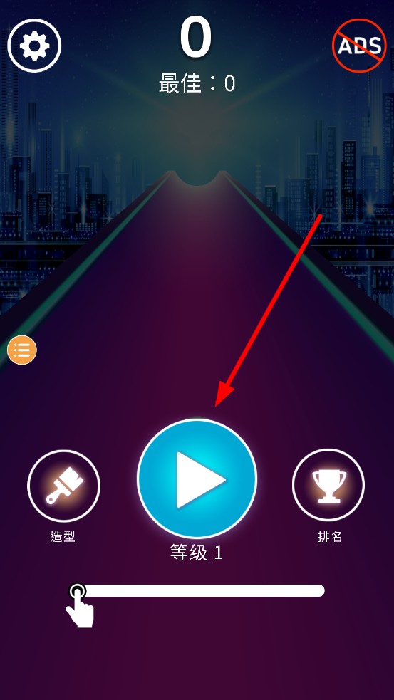 1、點擊主界面藍色播放鍵啟動游戲,拖動下方滑塊選定初始速度,小球即刻駛?cè)胭惖?,開啟賽道冒險之旅。