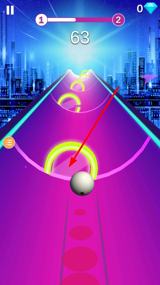 2、賽道滾動時,點擊屏幕左右區(qū)域,調(diào)控方向,引導小球穿入發(fā)光傳送門,觸發(fā)分數(shù)加成,若沒有通過發(fā)光傳送門,則游戲失敗。