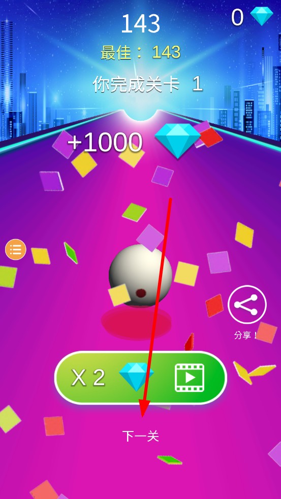 3、保持小球不脫離賽道,累計穿過傳送門達關(guān)卡目標數(shù)量后,通關(guān)畫面彈出,點擊下一關(guān),解鎖更復(fù)雜彎道。