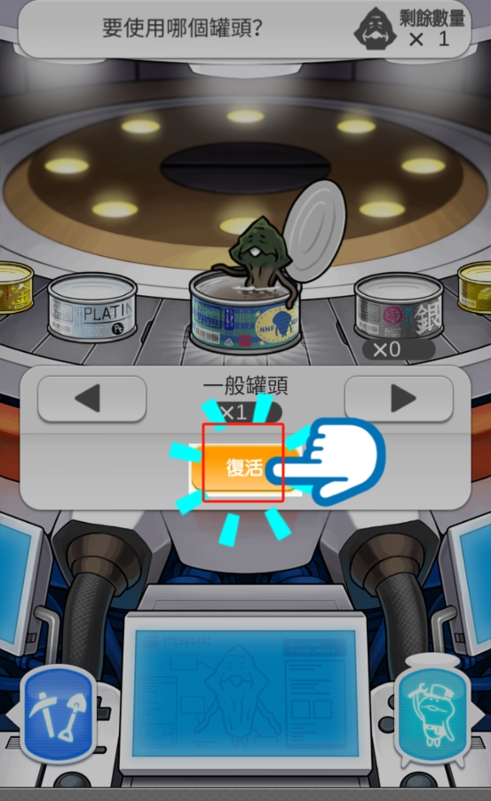 3、進(jìn)入罐頭選擇界面,對(duì)一般罐頭,點(diǎn)擊紅框內(nèi)復(fù)活按鈕,利用罐頭復(fù)活功能,來壯大隊(duì)伍的人數(shù)。