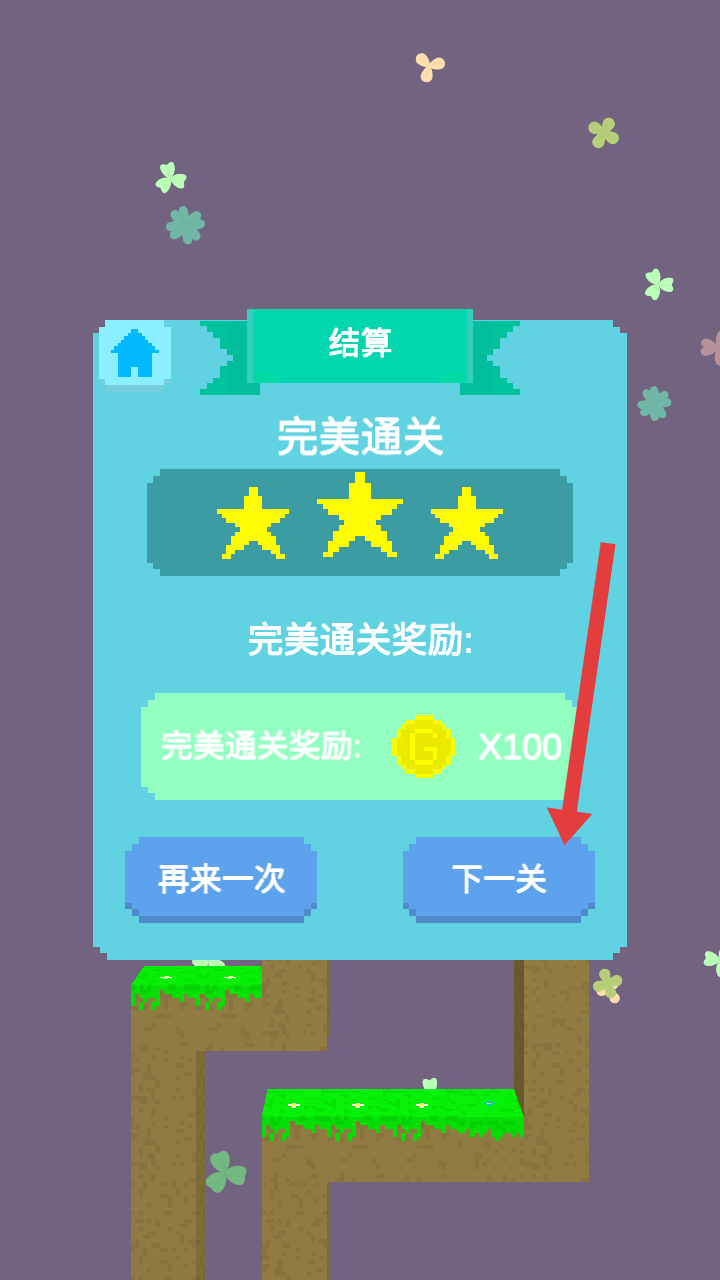 3、收集所有星星完美通關(guān)后,點(diǎn)擊界面右側(cè)下一關(guān)的按鈕,領(lǐng)取100金幣的獎勵,開啟新關(guān)卡挑戰(zhàn)。