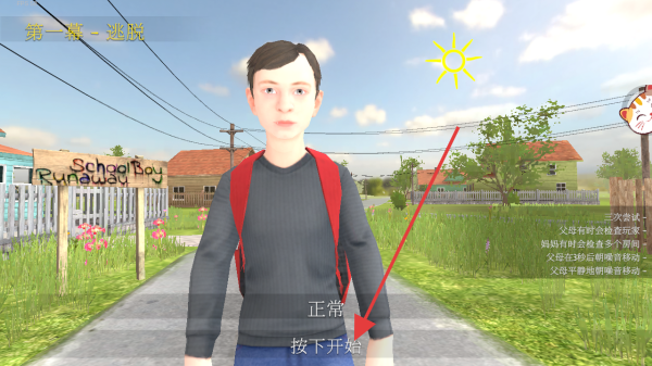 1、進入游戲第一幕“逃脫”場景,點擊按下開始,操控背著紅色書包的角色,在School Boy Runaway小鎮(zhèn)環(huán)境中開啟冒險。