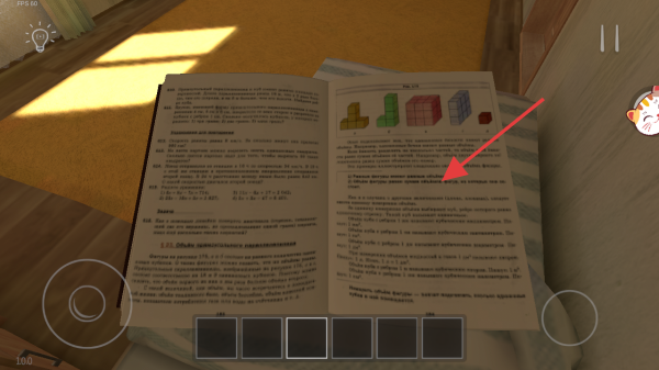 2、游戲中來到房間場景,觀察桌上打開的書本,留意箭頭指向的文字與立體圖形題目區(qū)域,收集線索、破解謎題。