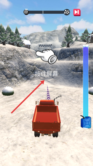 2、行駛過程里,長(zhǎng)按屏幕操控卡車前行,時(shí)刻留意右側(cè)燃料條,及時(shí)拾取藍(lán)色燃料罐維持動(dòng)力。