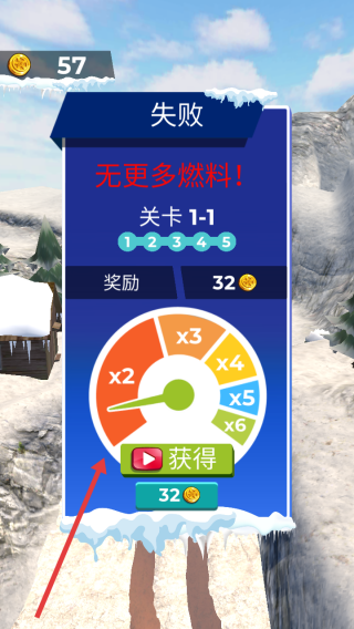 3、若因燃料耗盡失敗,點(diǎn)擊32領(lǐng)取金幣,觀看廣告可翻倍獎(jiǎng)勵(lì),積累資源升級(jí)卡車再戰(zhàn)。