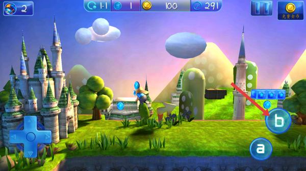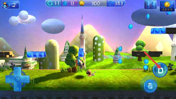 1、進(jìn)入游戲第一關(guān)卡,用左下角十字鍵控制角色移動(dòng),遇到藍(lán)色光環(huán)道具,靠近拾取,積累資源。