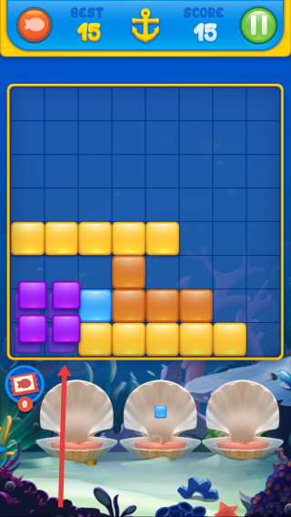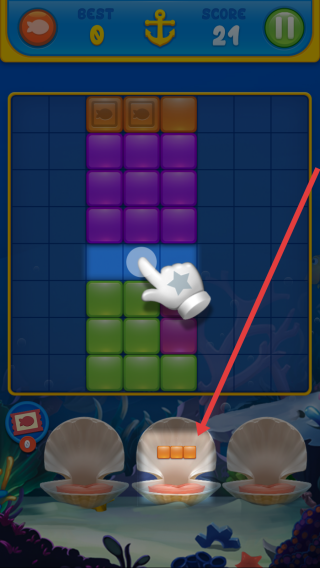 3、觀察網(wǎng)格中方塊分布,利用下方貝殼道具,組合對應(yīng)顏色方塊,消除得分,提升游戲成績。
