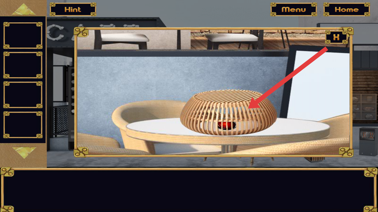 1、需要觀察場(chǎng)景內(nèi)圓桌上方的竹編容器,留意它的內(nèi)部有一個(gè)紅色的物件,可以選擇點(diǎn)擊試試能不能拾取。