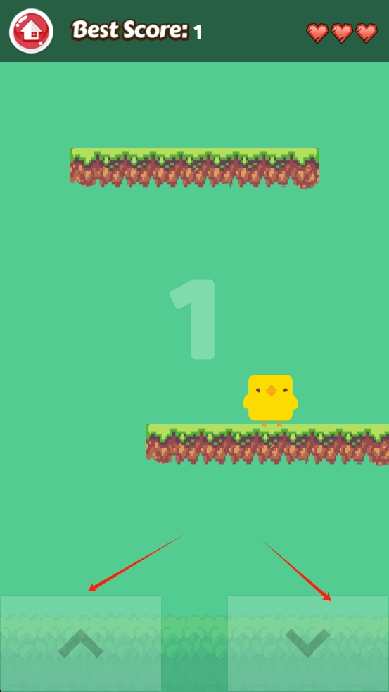 1、進(jìn)入作品后我們點(diǎn)擊屏幕下方左右箭頭按鈕,控制黃色小雞跳躍,跨越綠色草地間的溝壑,收集分?jǐn)?shù)。