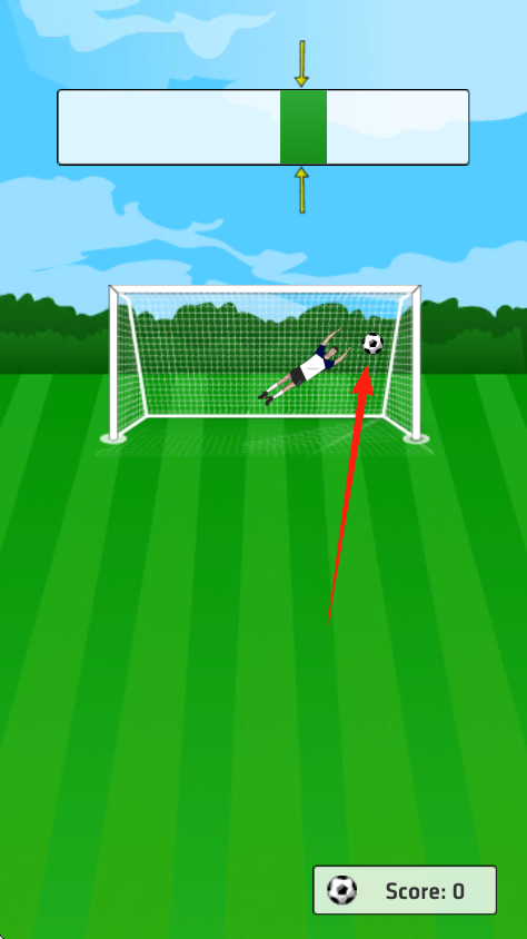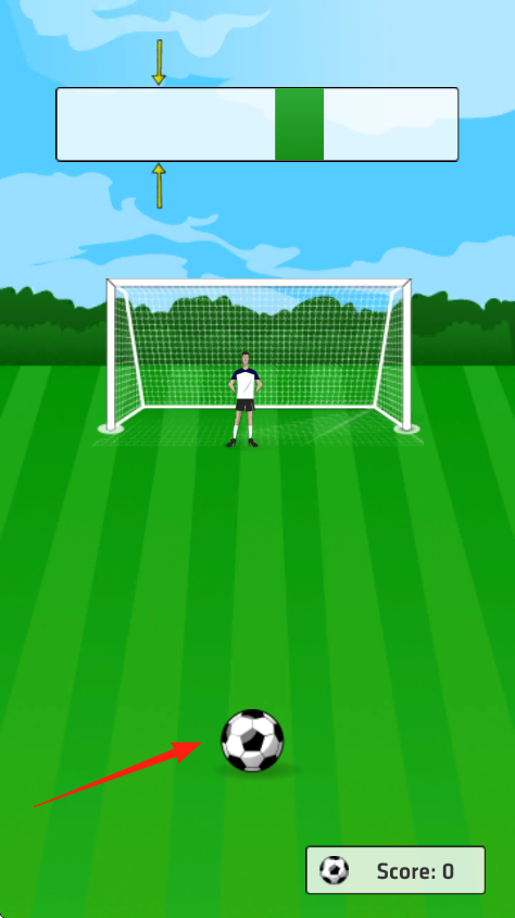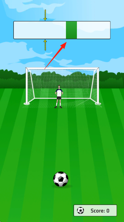 1、進(jìn)入到游戲界面,觀察球門上方移動(dòng)的綠色方塊,待其到合適位置,點(diǎn)擊足球,按箭頭方向射門。