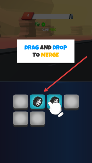 1、在初始界面,點(diǎn)擊PLAY,進(jìn)入合并玩法環(huán)節(jié),按DRAG AND DROP TO MERGE指引,合并輪胎或其他部件。