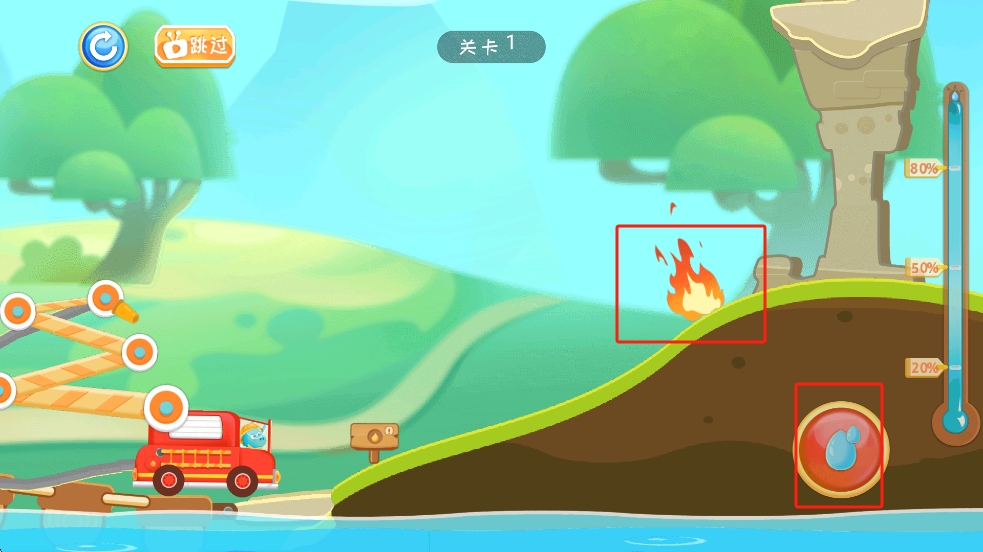 1、觀察畫面,右下角有紅色帶水滴的按鈕,點(diǎn)擊它為消防車儲(chǔ)水,接著滑動(dòng)上方的水管,調(diào)整其朝向,讓水管對(duì)準(zhǔn)山坡上的火焰。