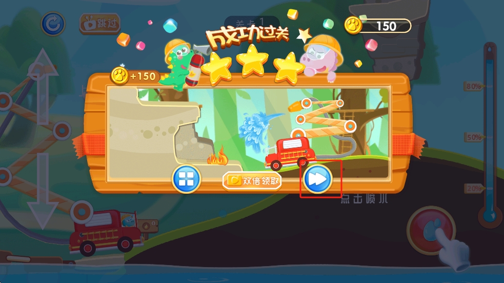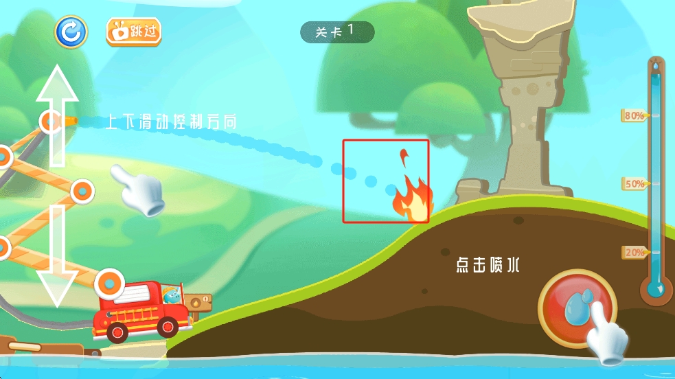 2、依據(jù)畫面提示,通過上下滑動(dòng)操作,精準(zhǔn)控制水管方向,在水管對(duì)準(zhǔn)火焰區(qū)域后,點(diǎn)擊噴水按鈕進(jìn)行滅火。