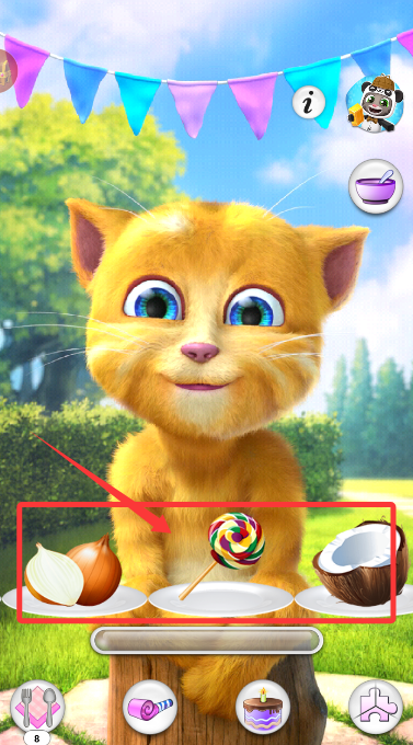 1、游戲界面展示多種互動道具,包括糖果、椰子等物品,可自由選取進(jìn)行互動。
