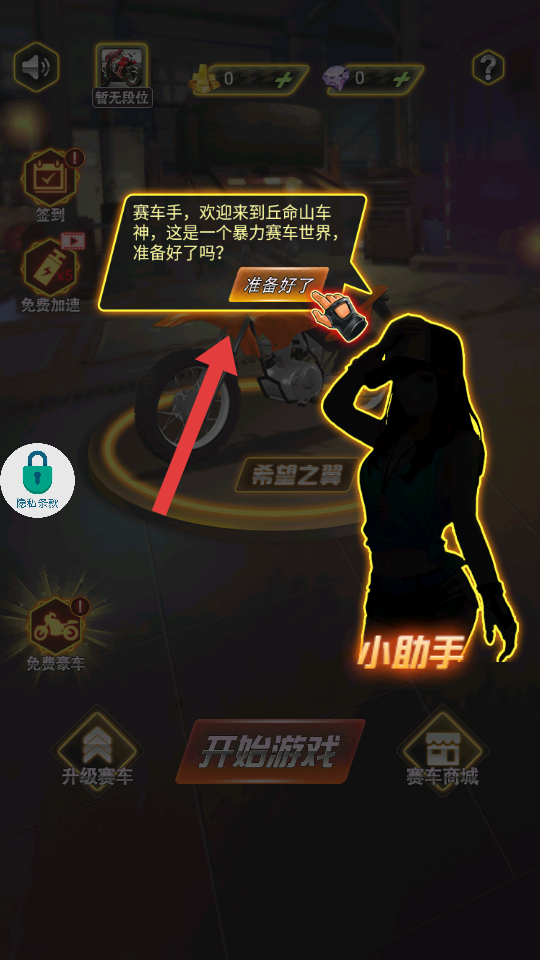 1、在丘命山車神的游戲主界面,需要跟隨指引點(diǎn)擊準(zhǔn)備好了的按鈕,開啟暴力賽車冒險(xiǎn)流程。
