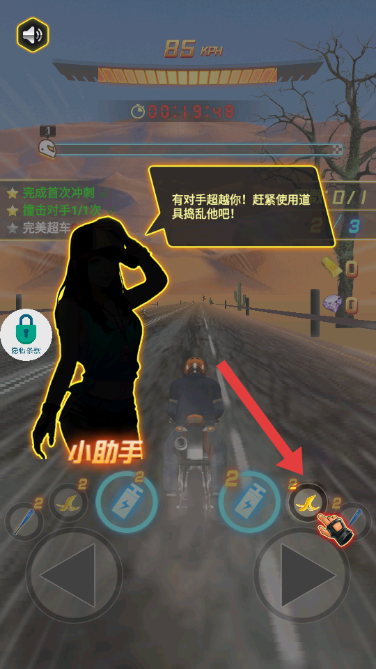 3、當(dāng)有對(duì)手超越時(shí),可以選擇點(diǎn)擊右側(cè)香蕉形道具的圖標(biāo),使用干擾的道具,來(lái)阻撓對(duì)手前進(jìn)。