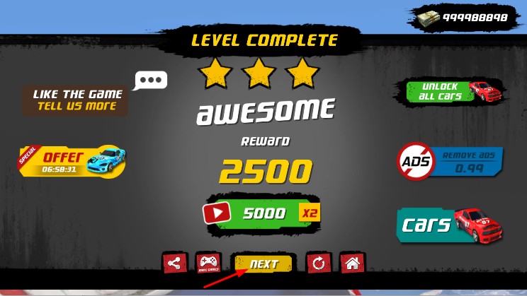 3、成功沖過終點,獲星星、金幣獎勵,點擊NEXT進入下一關(guān)。