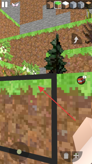 3、建造時,選擇方塊如草地方塊,點(diǎn)擊箭頭指向的地面區(qū)域,放置方塊,搭建建筑,打造專屬像素樂園。