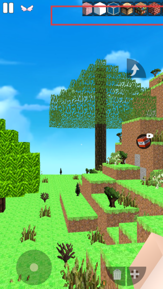 2、在游戲場景中,利用上方工具欄方塊、道具等,在綠色草地、樹木環(huán)境里,自由建造、探索,左側(cè)搖桿控制移動。