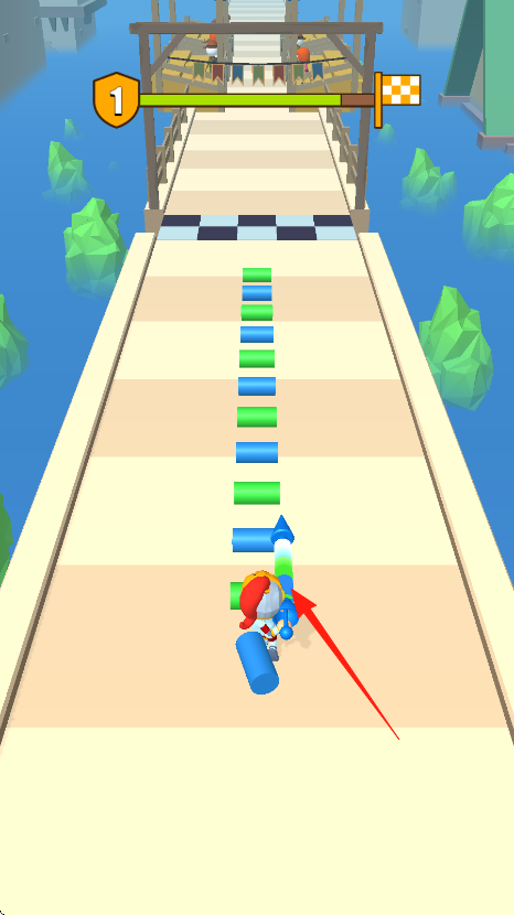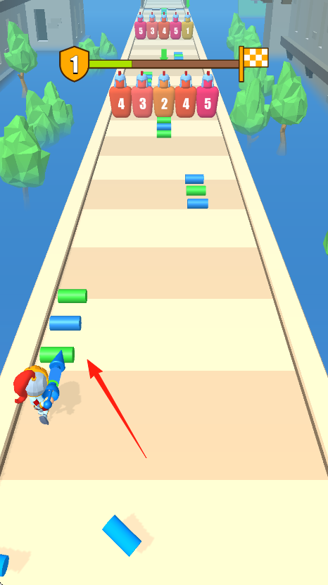 1、操控角色紅藍(lán)配色小人,沿跑道前進(jìn),按箭頭,收集綠色圓柱,增加堆疊數(shù)量。