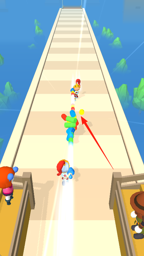 3、在多人賽道段,依據(jù)箭頭,收集圓柱同時(shí),和其他角色競爭,沖向終點(diǎn),用堆疊優(yōu)勢通關(guān)。