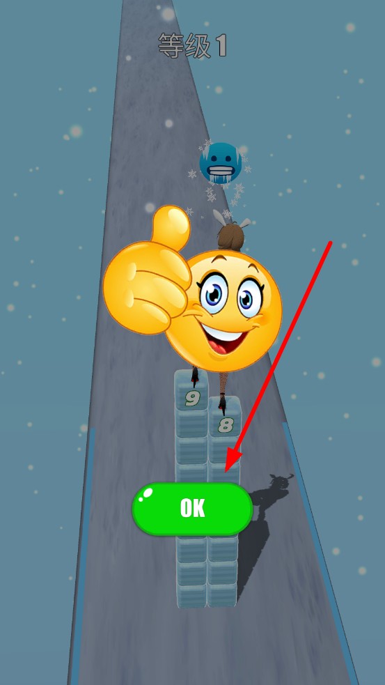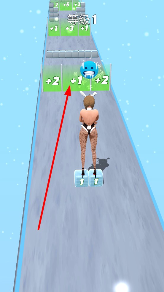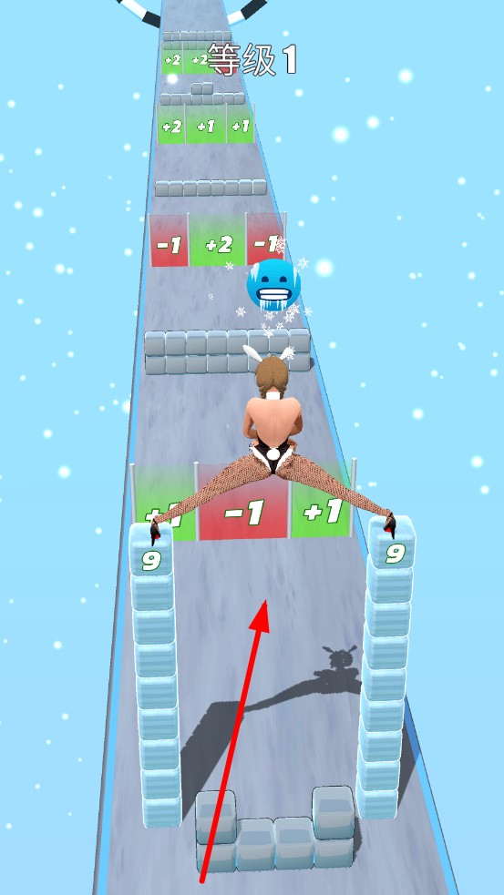 2、左右滑動(dòng)屏幕,控制人物腳伸長,觸碰綠色增益門,調(diào)整左右冰塊數(shù)量,從而抵達(dá)終點(diǎn)。