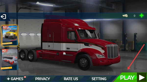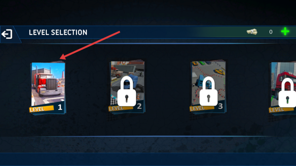 1、在車庫界面,點擊PLAY,進入關(guān)卡選擇頁,選解鎖的LEVEL1,開啟紅色卡車運輸挑戰(zhàn)。