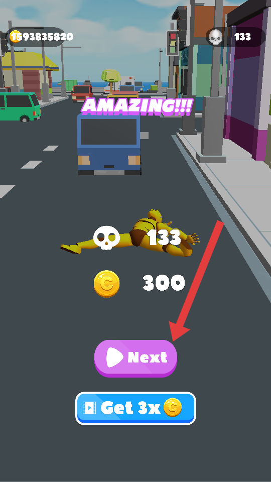 2、關卡結(jié)束后,若成功通關,點擊紫色Next按鈕可進入下一關,可以選擇觀看廣告,獲取3倍金幣獎勵。