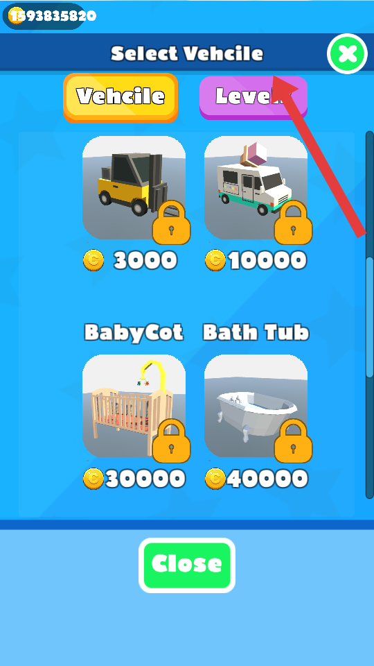 3、進入載具選擇界面,可以查看Forklift、Bath Tub等鎖狀載具,還能切換Level標簽,選擇消耗金幣解鎖新載具。