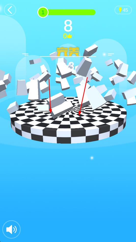 3、收集完畢后,平臺(tái)破碎,白球抵達(dá)底部棋盤格,達(dá)成關(guān)卡目標(biāo)。
