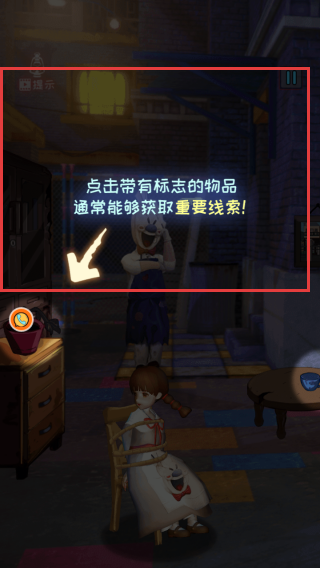 3、進(jìn)入場(chǎng)景后,留意“點(diǎn)擊帶有標(biāo)志的物品,獲取重要線索”提示,按指引互動(dòng),推進(jìn)劇情,躲避小丑角色。